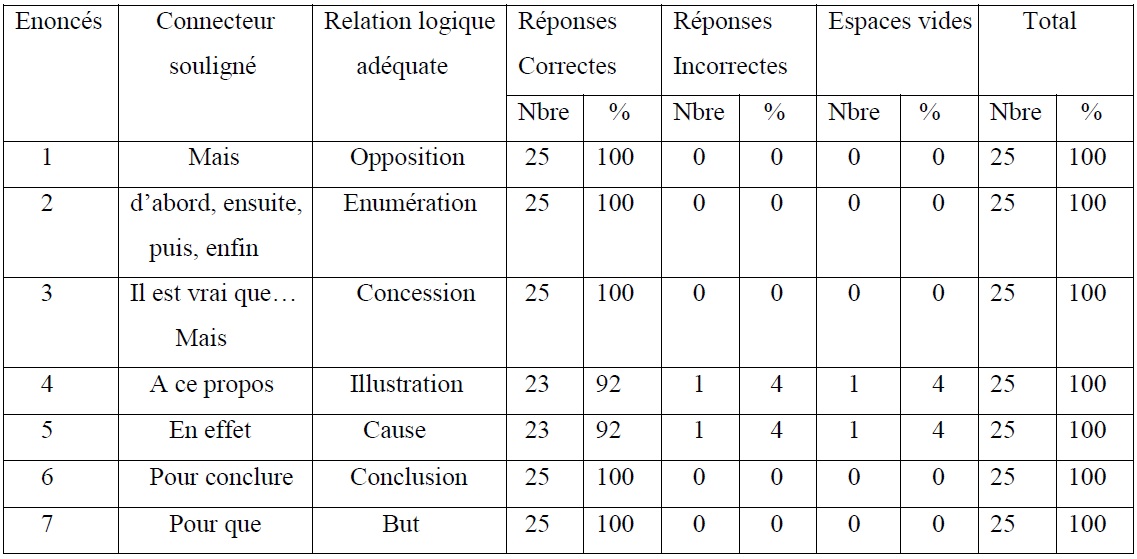 Tableau 2 Usage fait des connecteurs logiques par les élèves de 3°année secondaire, filière lettres et langues étrangères dans la daïra de Tizi-Ouzou 1Le même constat est à faire dans cet établissent, le taux de réponses justes a atteint