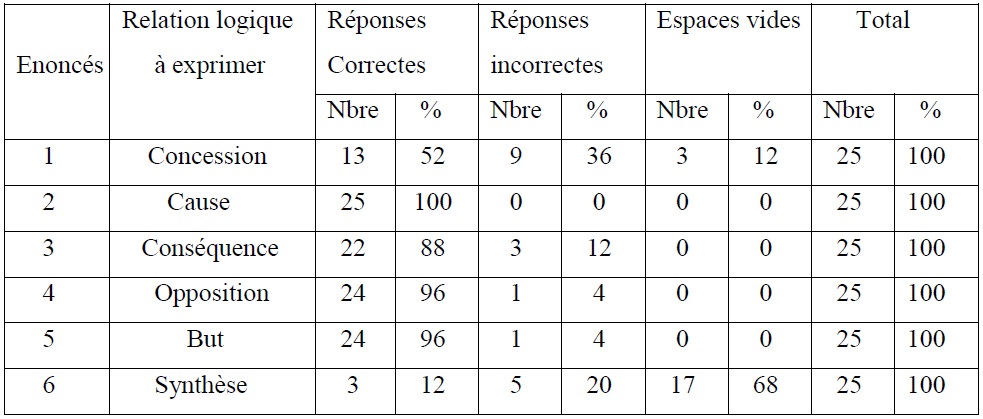 Tableau 7 Usage fait des connecteurs logiques par les élèves de 3°année secondaire, filière lettres et langues étrangères dans la daïra de Tizi-Ouzou 1Ce tableau livre les informations suivantes :