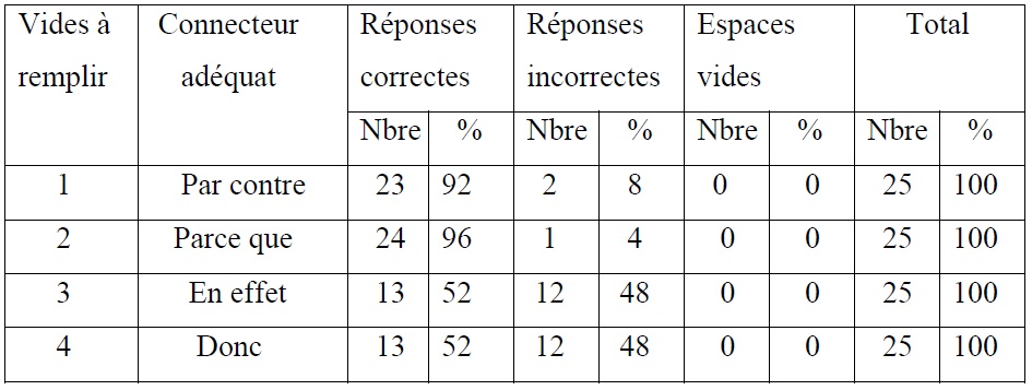 – « En effet » et « donc » : 12 emplois incorrects ——————> 48%.