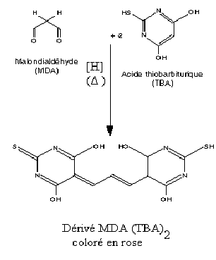 Le dosage du MDA au niveau de ces organes à été réalisé par une méthode spectrophotométriques : la méthode d’Ohkawa [Ohkawa et al., 1979], cette méthode utilise l’acide thiobarbiturique (TBA). En effet, une molécule de MDA en milieu acide et à chaud est condensée avec deux molécules de TBA pour formé un complexe coloré en rose (cf. figure 14) susceptible d’un dosage spectrophotométrique à une longueur d’onde λ = 532 nm [Michel et al., 2008]. Cette technique présente d’excellentes qualités sur le plan de la sensibilité, sauf qu’elle manque de spécificité à cause des interférences (molécules ne relevant pas du stress oxydant mais réagissant avec le TBA), mais elle reste le test le plus simple et le plus classique qui permet l’évaluation de la peroxydation lipidique [Beauvieux et al., 2002].