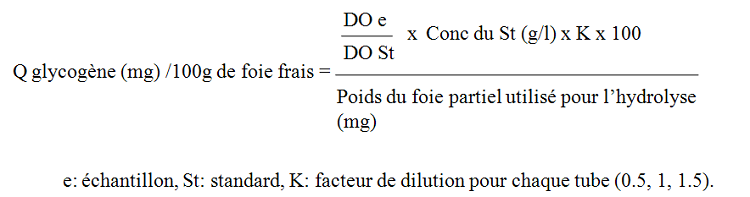 Les concentrations de glucose sont déduites d’une gamme étalon préparés à partir d’une solution standard de glucose à 0.5g/l (cf. annexe I). Le calcul des quantités de glycogène est réalisé grâce à l’équation suivante et cela pour les 3 tube : 0.5 ml, 1 ml, 1.5 ml préparés pour chaque échantillon. Les résultats sont exprimés en quantités de glycogène (mg) dans 100 g de foie pour chaque rat.