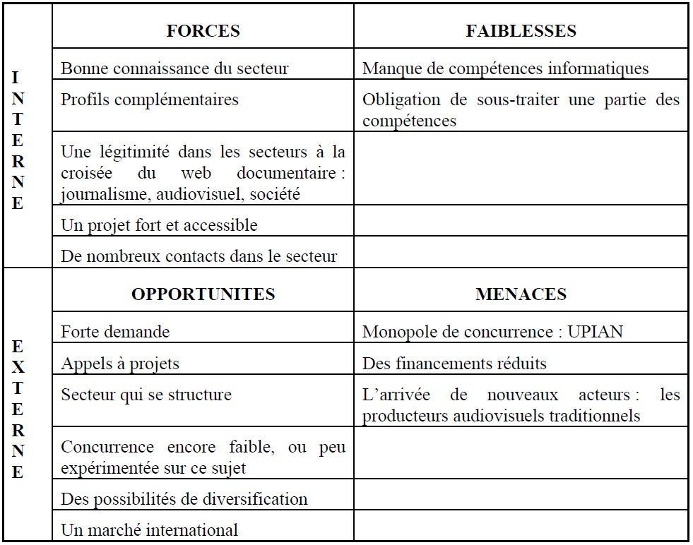 A la lecture de ce tableau, il apparaît que notre principal atout reste notre association. C’est à partir de nos profils respectifs et envies communes que nous avons décidé d’investir le web documentaire, c’est donc autour de ces mêmes éléments que nous allons bâtir notre projet de société.