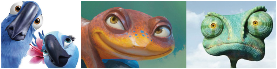 Illustration 17 : Newt (au centre), reptile abandonné à cause des oiseaux de Rio (à gauche) et du caméléon Rango (à droite).
