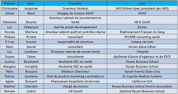 Ces personnes ont été interrogées sur plusieurs thématiques concernant la place des diplômés de GEC dans le monde de la santé.