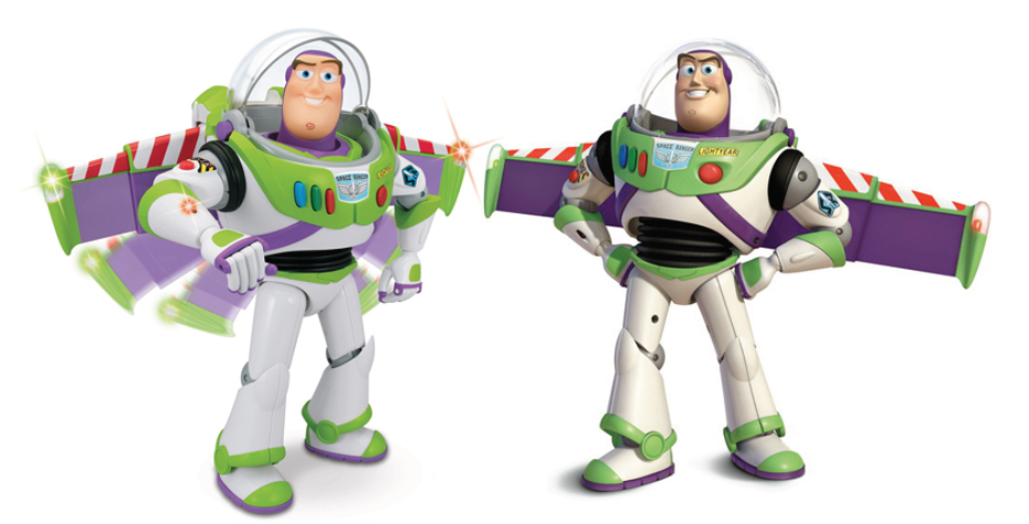Toy Story est le lien parfait entre le cinéma et les produits dérivés car les héros sont des jouets. Parmi eux, des jouets déjà existants dont Monsieur Patate, Barbie ou encore le téléphone parlant Fisher-Price. Mais les figurines mondialement connues doivent partager la vedette avec de nombreux jouets conçus spécialement pour le film. Parmi eux, les deux héros : Buzz L’Éclair et Woody le cowboy. Alors que ce dernier est un jouet en peluche surmonté d’une tête en bois, le deuxième est une figurine articulée de nouvelle génération avec tout un attirail de fonctionnalités dont des ailes rabattables et un rayon laser. Le film est vite devenu une vitrine pour les enfants en créant des jouets de qualité. Buzz, par son côté futuriste, est vanté dans une pub diffusée dans le film. Il est le jouet à posséder absolument, celui-là même capable de rendre les autres jouets jaloux. Dans le deuxième volet, les personnages à la recherche de Woody entrent dans un magasin de jouets et tombent dans un rayon rempli de Buzz L’Éclair encore emballés. La chose est impressionnante d’autant plus que le film se passe cinq ans après son prédécesseur. Buzz est toujours un incontournable dans la réalité comme dans la fiction.