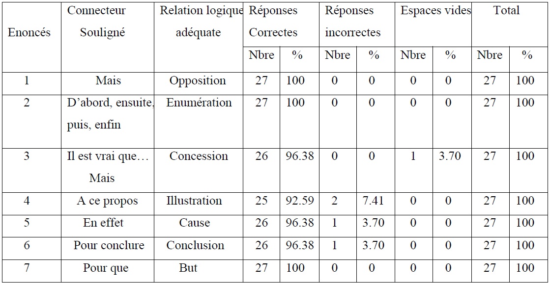 Le taux de réponses correctes a atteint 100% dans trois (03) phrases exprimant les