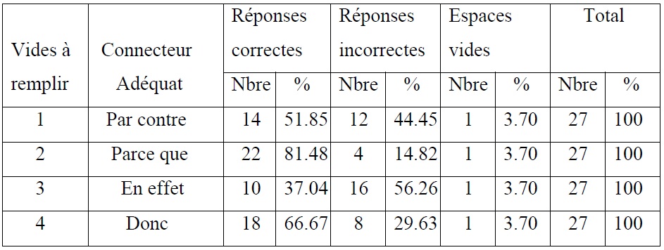 Les connecteurs qui sont ici l’objet d’erreurs sont « en effet » (59,26%) et « par