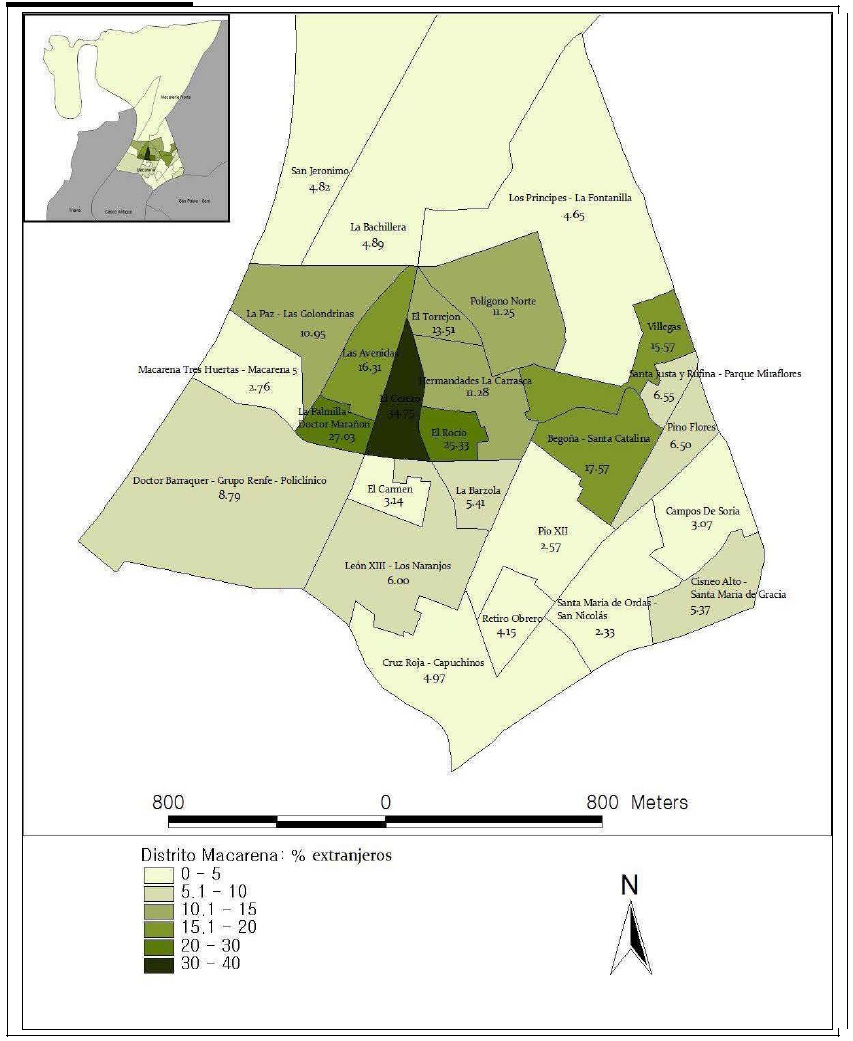Cartigraphie  5 Ségrégation et dynamiques multiculturelles à Séville le cas du quartier El CerezoSource : Carte tirée du Diagnostico sobre el asentamiento de poblacion inmigrante extranjera en el distrito