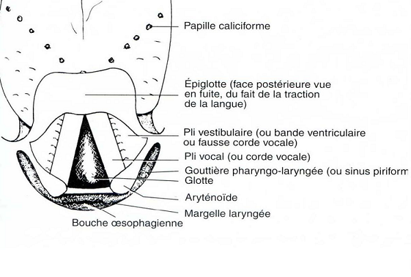 – la position du repos (abduction) : les plis vocaux sont éloignés l’un de l’autre, l’épiglotte se rabatte en arrière
