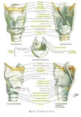Le larynx est l’extrémité supérieure du tube trachéale. C’est l’organe principal de la voix. Mais ce n’est la qu’une fonction secondaire ; sa fonction première est celle d’un sphincter permettant l’obturation de la Trachée. Il est constitué de cartilages reliés entre eux par des ligaments et par des muscles recouverts par une muqueuse.