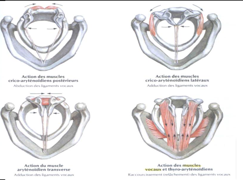 – Rotation sur l’axe verticale vers l’intérieur du cricoïde pour rapprocher les plis vocaux ou vers l’extérieurs pour du cricoïde pour éloigner les plis vocaux.