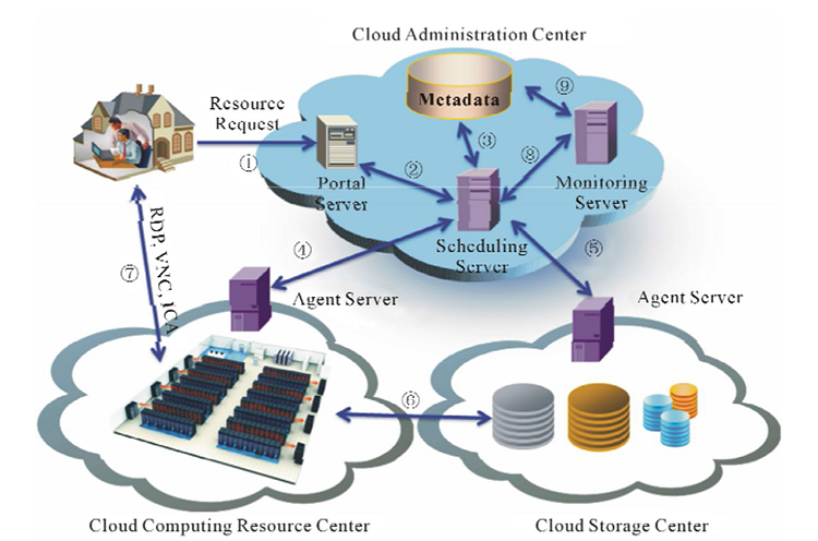 – Le centre d’administration du cloud : C’est l’interface livrée aux utilisateurs, accessible via un portail Web. Il permet l’utilisation des ressources du cloud mais aussi leur administration. Le centre d’administration du cloud IaaS reçoit les requêtes de la part des utilisateurs et crée les ressources demandées à leur endroit.