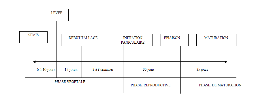 La plante du riz comporte : les organes végétatifs (racines, tiges, et feuilles) et les organes floraux (panicules comportant les épillets). La vie d’un plant de riz se divise en trois phases : La phase végétative qui commence de la germination à l’initiation paniculaire, La phase reproductive qui commence de l’initiation paniculaire à la floraison et La phase de maturation qui commence de la floraison à la maturité