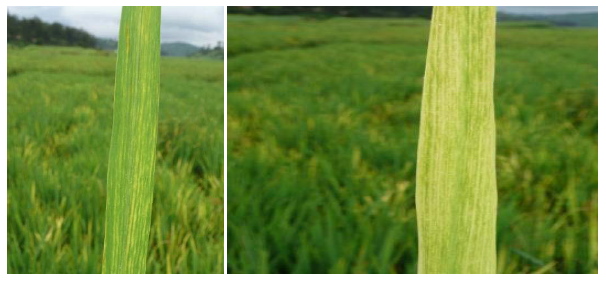 La chlorose est la réduction de la pigmentation verte. Comme la pigmentation verte des feuilles constitue l’indispensable chlorophylle qui capte l’énergie, la chlorose réduit la photosynthèse et par conséquent une croissance de la plante. Le rabougrissement se réfère à une réduction sévère de la taille de la plante : les plants de riz infectés sont beaucoup plus courts que les plants sains. Les panicules portent les grains de la plante et sont donc essentielles à un bon rendement. Dans les champs infestés de panachure jaune du riz, les panicules ne poussent pas normalement (WARDA, 2000). En outre, beaucoup de grains des panicules infestées sont stériles (Kouassi et al., 2005). Lorsque l’infection est précoce (avant deux semaines après le semis), les plantules des cultivars sensibles meurent. L’infection de la parcelle peut se présenter sous diverses formes. En effet des parcelles avec un taux d’infection élevé ou complètement infectées peuvent être contiguës à des parcelles sans infection apparente (Sarra, 2005). De larges ou petites tâches en formes irrégulières ou cicatricielles apparaissent dans certaines rizières alors que ce sont de petites tâches allongées qui sont occasionnellement observées le long des digues, des pistes et aux angles de la parcelle. Ces différentes formes de symptômes sur les parcelles indiquent une propagation de la maladie par plusieurs mécanismes (bétail, eau d’irrigation, outils aratoires) (Sarra, 2005). Les rizières infectées présentent en général un aspect jaune orange.
