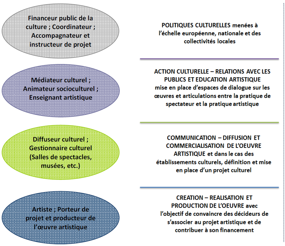 – la diffusion culturelle, qui inclue à la fois les circuits de diffusion interne (salles de spectacle) et les circuits de diffusion externe (lieux festivaliers) ;