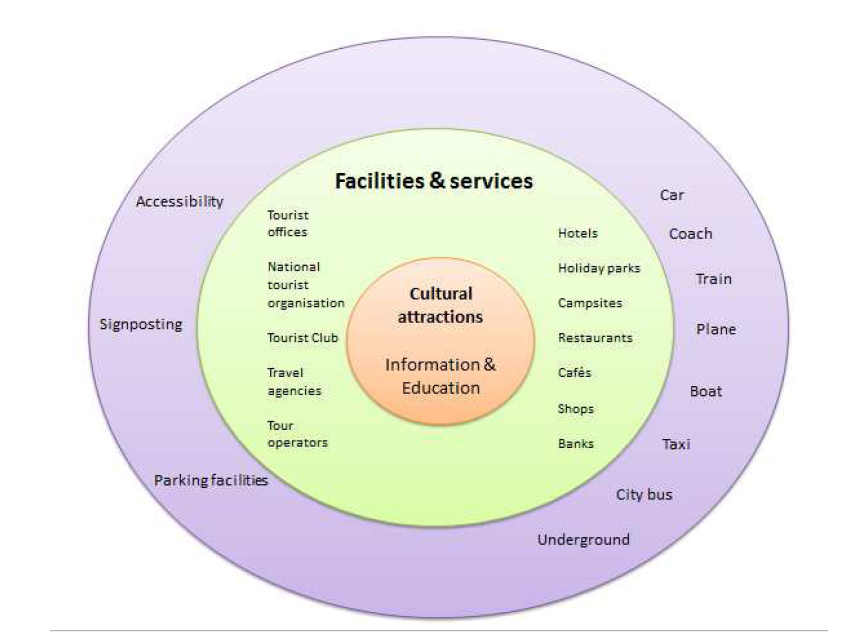 On relève au sein des nombreuses composantes du tourisme, une diversité d’acteurs touristiques qui peuvent graviter autour d’une offre culturelle, comme l’indique le schéma suivant. Y sont situés d’une part, les « metteurs en scène touristiques » que représentent les offices de tourismes, les agences de voyage, etc. harmonisant les atouts locaux à travers des logiques de valorisation et d’attraction touristique du territoire. Y sont placés d’autre part, l’ensemble des industries hôtelières et restauratrices, les infrastructures de transports ainsi que les divers aménagements visant à faciliter l’accès des visiteurs aux sites touristiques. L’économie du tourisme ne se limite donc pas à un secteur d’activité mais concerne bien plusieurs services.