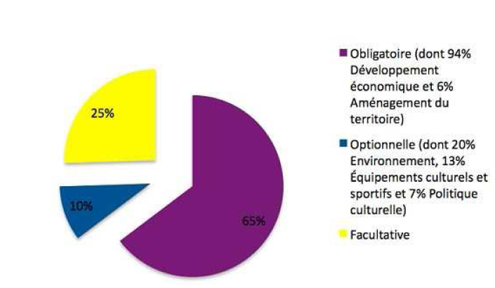 « 66 % des « intercommunalités » […] ont adopté la compétence culturelle et les trois quart sont « actives » en matière culturelle (ayant ou non adopté la compétence) : elles interviennent notamment dans le financement ou la gestion d’équipements structurants transférés (44% sont des lieux de lecture publique, 17% des écoles de musique, de danse ou de théâtre, 16% des lieux de spectacle vivant), permettant un partage des « charges de centralité » pesant sur les villes et une mise en réseau des structures, voire une harmonisation des tarifs (par exemple pour les écoles de musique) » (7) Investie de missions sociales fortes et symboliques, la compétence culturelle en France est mieux identifiée et plus autonome par rapport à la compétence touristique dont les contours sont plus flous. Une étude(8) menée par le Conseil National du Tourisme en 2004-2005, a montré que les EPCI (Etablissement Public de Coopération Intercommunal) avaient quelques difficultés à clarifier et à identifier la notion de la compétence tourisme. Ces difficultés sont liées à des facteurs d’ordre « réglementaire » et « conceptuel ». Les EPCI ont en effet plusieurs possibilités d’inscrire le tourisme : soit dans le cadre des compétences obligatoires, optionnelles ou facultatives. L’inscription du tourisme dans un cadre réglementaire, est liée à la volonté d’action publique menée en la matière. Généralement le tourisme est intégré à la compétence économique qui est obligatoire. De même que sur le plan national, l’administration du tourisme est fondue dans plusieurs directions rattachées au Ministère de l’Economie et des Finances. Une enquête(9) plus récente menée en 2010 sur les communautés et la compétence tourisme relève que 65% des communautés ont choisi de rattacher leur compétence tourisme à la compétence « développement économique». D’autres communautés ont rattaché le tourisme à la compétence « environnement » (20%) comme l’indique le diagramme à la page suivante.