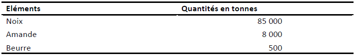 Malgré la richesse informationnelle de ce tableau, nous pouvons ici souligner le fait que les potentielles de production, de collecte et de consommation ci-dessus exprimées ne spécifient pas s’il s’agit de noix, d’amandes et/ou de beurre.