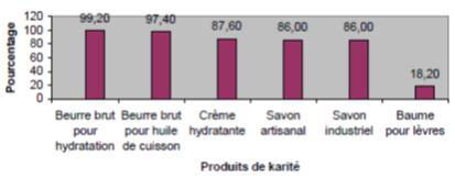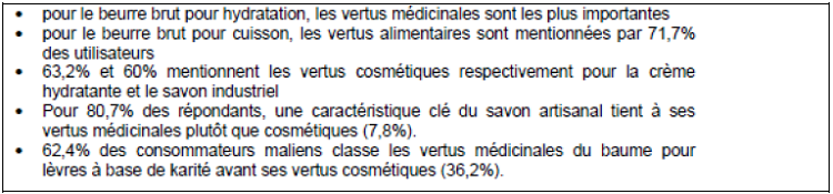 Une étude intéressante du CECI sur l’image de marque du karité en 2007 donne des informations sur la consommation malienne de karité. C’est le résultat d’une enquête dont la taille de l’échantillon était de 500 urbains (de Bamako et Sikasso).