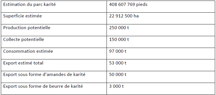 Deuxième producteur de karité au monde après le Nigéria, le Mali occupe la sixième place en termes d’exportations. Selon la FAO, en 2008, le Mali a enregistré une production de noix de karité de 190 000 tonnes. Alors même que le potentiel du parc est estimé à 250 000 tonnes pour cette même année, soit une production globale de noix de karité égale à 76% du potentiel estimé.