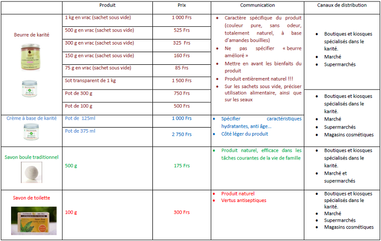 Nous avons donc croisé les différentes analyses faites au niveau international, sous régional et local, puis nous avons pris en considération les capacités de l’union d’Yiriwasso pour formuler une offre de produit à mettre en avant. Veuillez trouver ci-dessous cette offre de produit adaptée au développement de l’union de productrices de beurre de Yiriwasso.