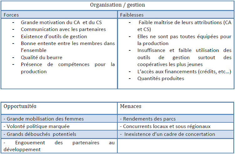 Une fois les acteurs identifiés et après avoir dressé un portrait des différentes coopératives maliennes nous avons pu mettre en avant une matrice SWOT pour les coopératives productrices de karité.