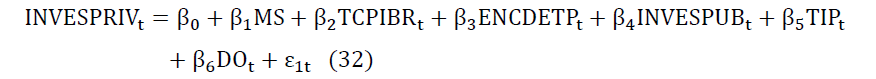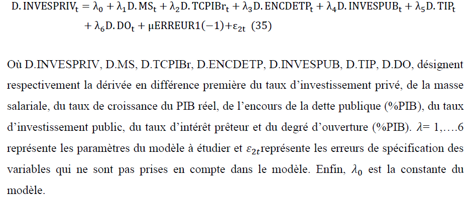L’estimation du modèle de court terme permet d’avoir l’effet immédiat d’une politique macroéconomique sur un phénomène étudié. Il s’agit ici d’observer comment les variables explicatives de notre modèle affectent l’investissement privé au Bénin. Le modèle de court terme à estimer est le suivant :