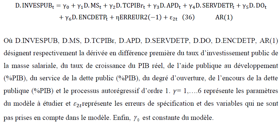 L’estimation du modèle de court terme permet d’avoir l’effet immédiat d’une politique macroéconomique sur un phénomène étudié. Il s’agit ici d’observer comment les variables explicatives de notre modèle affectent l’investissement public au Bénin. Le modèle de court terme à estimer est le suivant :