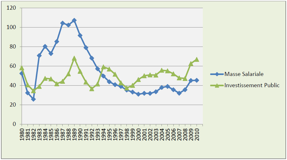 De 1980 à 1989 la masse salariale a évolué et est passée de 52,4% des recettes fiscales à 107,2%. Quand à l’investissement privé, il a connu une évolution dans le même sens et est passé de 94% des recettes fiscales à 97,6%. A partir de 1989, le taux de masse salariale a commencé par baisser jusqu’à s’établir à 45,3%. Par contre, au cours de la même période, l’investissement privé a augmenté jusqu’à atteindre 131,4% des recettes fiscales.