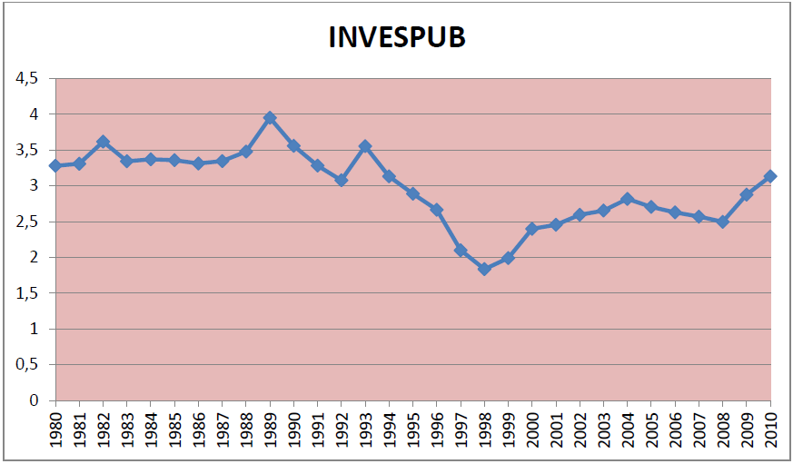 Celle allant de 1980 à 1989 où l’investissement public a connu une augmentation pour atteindre sa valeur maximale en 1989 qui est de 3,9% du PIB malgré la crise économique et financière.