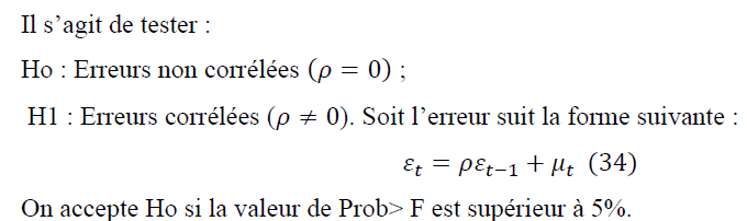 Ce test nous permet de détecter si les erreurs sont corrélées ou pas entre elles. C’est-à-dire de vérifier si l’espérance mathématique du terme d’erreur est nulle (erreurs non corrélées) ou différent de zéro (erreurs corrélées).