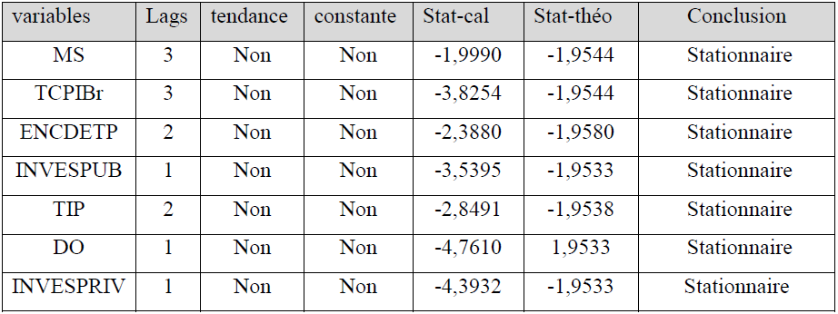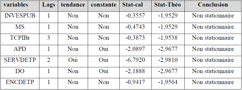 De l’analyse du tableau 3 sur les résultats du test de stationnarité, il ressort qu’aucune des variables n’est stationnaire en niveau. La recherche de l’ordre de l’intégration devient nécessaire. (Voir annexe 3)