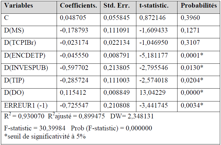 De l’analyse du tableau 5, il ressort que le coefficient de détermination R² = 0,945538 indique que la qualité de la régression du modèle de long terme est bonne. C’est-à-dire que les fluctuations du taux d’investissement privé sont expliquées à 94,5538 % par les variables explicatives du modèle.