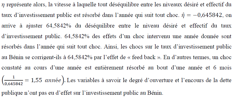 Contrairement au long terme, le service de la dette publique influence négativement et significativement au seuil de 5% l’investissement public à court terme au Bénin. Une augmentation de un (01) point du service de la dette publique entraîne une baisse de 0,022056 point du taux d’investissement public au Bénin.