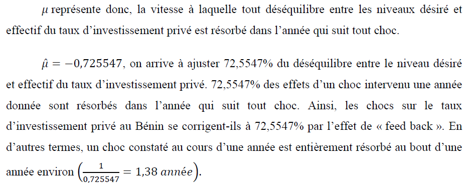 Tout comme à long terme, le taux d’intérêt prêteur exerce une influence négative et significative sur le taux d’investissement privé. Ainsi, lorsqu’on accroît de un point le taux d’intérêt prêteur, le taux d’investissement privé baisse de 0,285724.