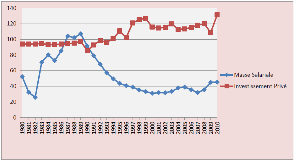 De 1980 à 1989 la masse salariale a évolué et est passée de 52,4% des recettes fiscales à 107,2%. Quand à l’investissement privé, il a connu une évolution dans le même sens et est passé de 94% des recettes fiscales à 97,6%. A partir de 1989, le taux de masse salariale a commencé par baisser jusqu’à s’établir à 45,3%. Par contre, au cours de la même période, l’investissement privé a augmenté jusqu’à atteindre 131,4% des recettes fiscales.