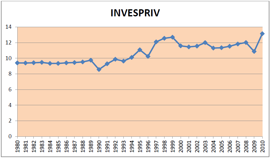 Le taux d’investissement privé a globalement connu une évolution constante avant d’entamer une croissance à partir de 1990. Le graphique 5 ci-dessous montre que de 1980 à 1989, l’investissement privé en pourcentage du PIB est presque constant et tourne autour de 9,5%. Ce faible niveau du taux d’investissement privé s’explique par les déséquilibres et distorsions qu’a connus le Bénin dans les années 80 dans les domaines de finances publiques, du crédit et de la répartition des investissements.