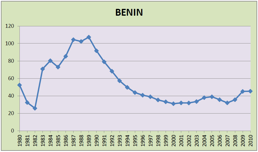 Par ailleurs, de 2000 à 2004, ce taux a connu une légère baisse avant de connaître de reprise jusqu’en 2010. Cette augmentation pourrait s’expliquer par l’orientation de la politique économique à travers la relance et la dynamisation du secteur privé par le gouvernement béninois et par la mise en oeuvre de l’initiative PPTE, du DSRP et de la SCRP. (Voir graphique 8)