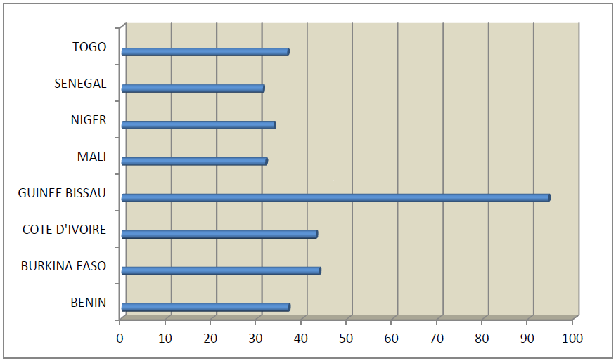 A l’instar du Togo, la masse salariale moyenne, en pourcentage des recettes fiscales au cours de cette dernière décennie (2001-2010) au Bénin, est légèrement supérieure à la norme communautaire de convergence pour les huit (08) pays de l’UEMOA (35%), 36,6% pour le Togo et 36,8% pour le Bénin. Au même moment, le Mali, le Niger et le Sénégal présentent des taux moyens de masse salariale inférieurs à 35%. Ces trois (03) pays ont enregistré des taux moyens de masse salariale respectifs de 31,8%, 33,6% et 31,6%. Par contre, le Burkina Faso, la Côte d’Ivoire et la Guinée Bissau ont un taux de masse salariale largement supérieur à la norme de convergence, respectivement 43,6%, 42,9% et 94,2%.