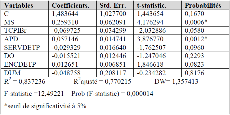 De l’analyse du tableau 5 présenté ci-dessus, il ressort que seul le coefficient du taux de croissance du PIB réel n’est pas significativement différent de zéro (0) avec pour probabilité prob = 0,4071.