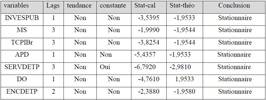Le tableau 7 présente les résultats du test de stationnarité sur les variables