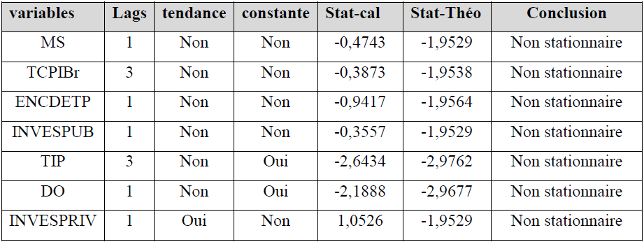 Le tableau 4 montre que toutes les variables du modèle sont stationnaires en différence première. D’où elles sont intégrées d’ordre un (1) (voir annexe 3). Le fait que toutes les séries sont intégrées d’ordre un (1) nous fait penser à la présence de relations de coïntégration.