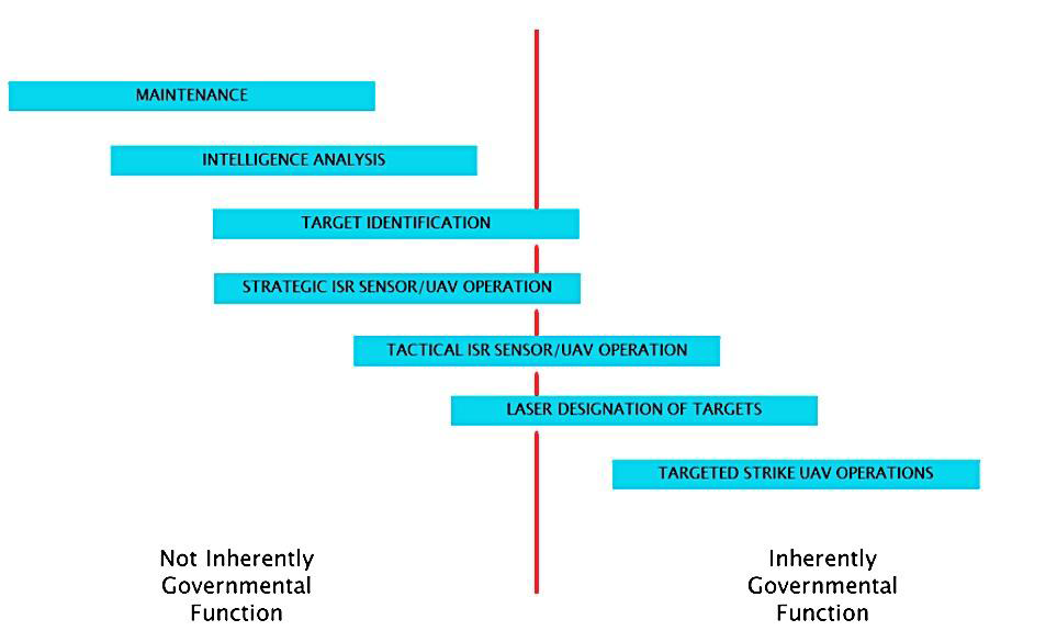 Il apparaît délicat de différencier clairement ce qui serait du monopole de l’Etat et ce qui ne le serait pas. A cet égard, une étude récente d’un capitaine de l’US Air Force(178) concernant le domaine des drones illustre cette difficulté. Pour cet officier américain, seules les opérations de frappe appartiennent par essence au domaine régalien tandis que la maintenance et l’analyse du renseignement peuvent être externalisés sans inquiétude. En dehors de cela, il y aurait une zone hybride de fonctions pas complètement étatiques mais pas tout à fait « externalisables », comme l’illustre la figure suivante :