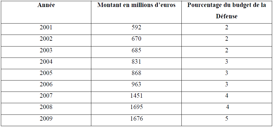 Si Gérard Longuet a pu dire, lorsqu’il était ministre de la Défense et des Anciens combattants (février 2011 – mai 2012), qu’il n’y avait pas et qu’il ne devait pas exister de sociétés militaires privées en France(117), sans doute voulait-il faire valoir que l’Hexagone ne verrait pas naître sur son territoire des sociétés à la réputation sulfureuses telles que Blackwater ou DynCorp. En tout cas, l’externalisation dans le domaine de la défense est une réalité que l’on ne peut pas nier et qui connaît une progression constante depuis une dizaine d’années, comme l’illustre le tableau suivant, établi à parti des chiffres du Secrétariat Général pour l’Administration (SGA)(118).