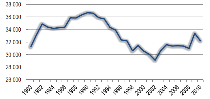 Nous reprenons ici certaines analyses faites par Martial Foucault dans le cadre de son étude sur les budgets de Défense en France(95). Pour le chercheur français, trois périodes doivent être distinguées : (1) la décennie 1980-1990 ; (2) la période des « dividendes de la paix(96) » entre 1990-2002 et (3) le réinvestissement de la défense entre 2002 et 2010.