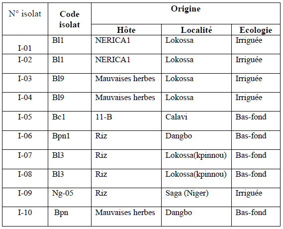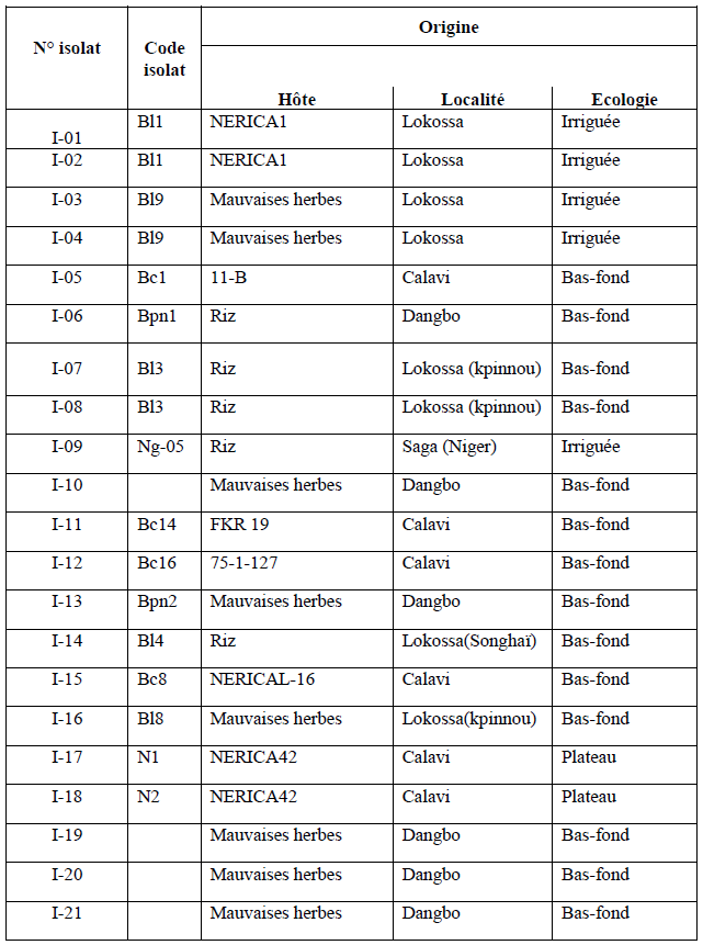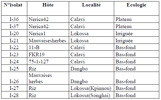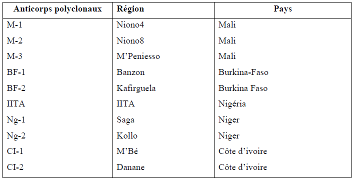 Un total de 21 isolats ont été sélectionnés pour le test sérologique avec l’utilisation d’anticorps polyclonaux et 11 isolats pour le test sérologique avec les anticorps monoclonaux. Nous avons ajouté aux isolats collectés dans le Sud-bénin, un isolat qui nous a été gracieusement offert par Issaka Souley, un étudiant nigérien en thèse.