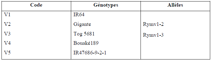 Cinq (05) variétés de riz choisies au sein des variétés établies par l’unité de la phytopathologie du Centre du Riz pour l’Afrique ont été utilisées pour évaluer la pathogénie des différents isolats de RYMV.