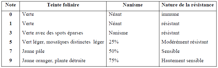 Tableau 7: Echelle de notation de l’évolution de la maladie de la panachure jaune du riz en fonction de l’intensité des symptômes.