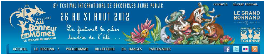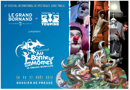 Bénévoles, professionnels du tourisme, élus, habitants locaux font part de leur expérience personnelle du festival et de leurs façons différentes de percevoir la relation de l’évènement avec leur territoire et la manière dont ils se l’approprient. La rédaction de cet ouvrage se situe également dans une démarche coopérative car elle participe à la construction et à la reconnaissance de l’identité du festival de Chaillol. Le directeur artistique souhaiterait par ailleurs disposer de plus de moyens pour recruter un coordinateur de réseau dont la mission consisterait notamment à mieux relier entre elles, l’ensemble des actions conduites entre les gens du cru, les acteurs touristiques et les organisateurs du festival. Ce qui est le cas pour l’office de tourisme du Grand-Bornand qui co-organise le festival Au Bonheur des Mômes avec le Théâtre de la Toupine où il y a la présence au sein de l’équipe du festival, d’un coordinateur de projet. Celui-ci assure en partie les relations entre le pôle tourisme et le pôle artistique. Les supports de communication du festival mettent en évidence, comme on peut le voir ci-dessous, qu’il s’agit bien d’une co-organisation festivalière, à travers la façon dont sont disposés le logo de l’office de tourisme et celui du théâtre de la Toupine. Cette association visuelle montre que les deux structures conçoivent ensemble l’évènement, qui dispose lui aussi de son propre logo.