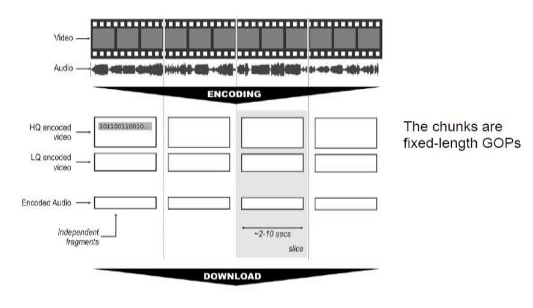 – Fragmentation de la vidéo en objets plus petits (chunks) de 2 à 4 secondes pour la distribution (en fonction du GOP par ex.) ;